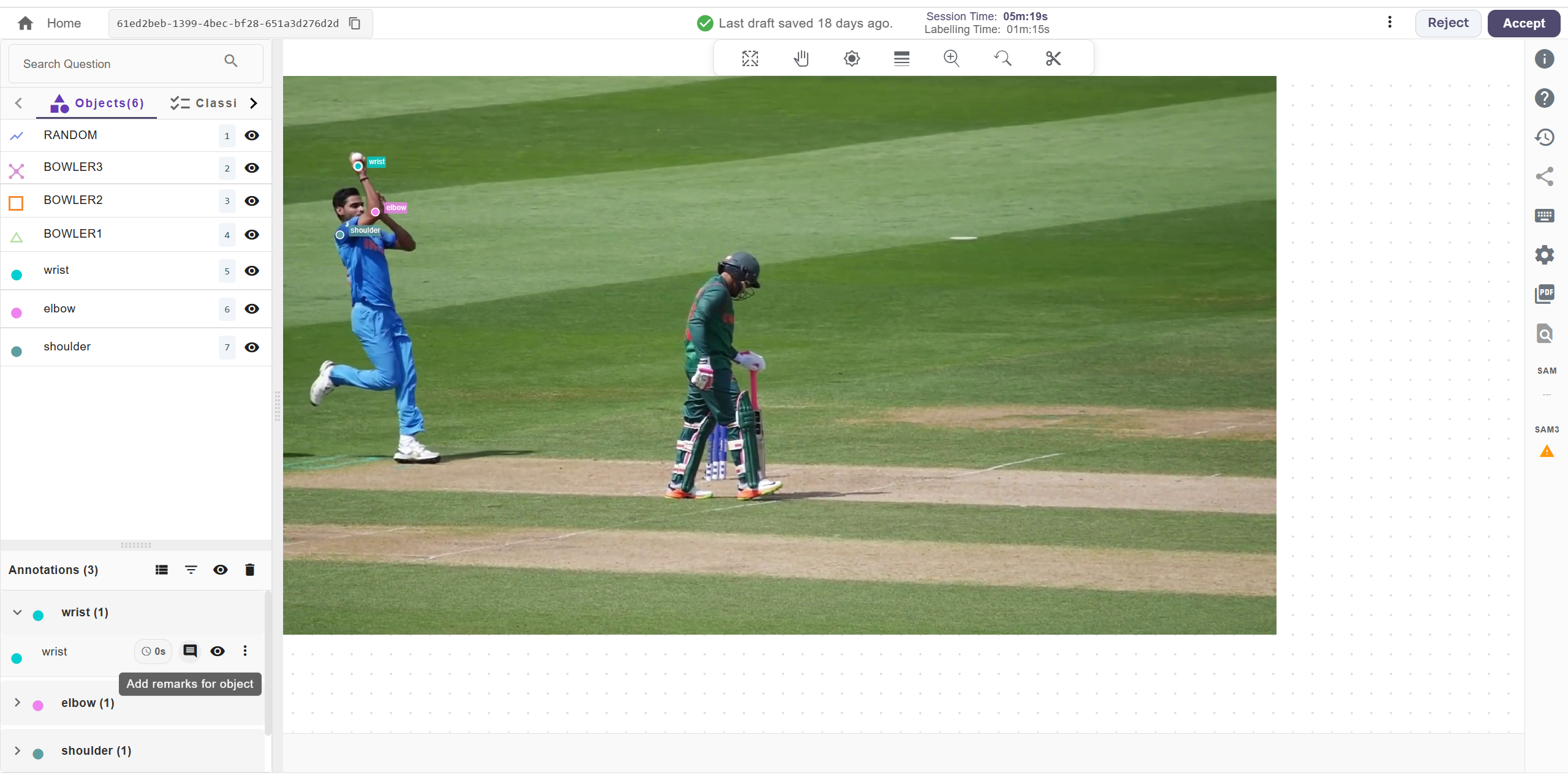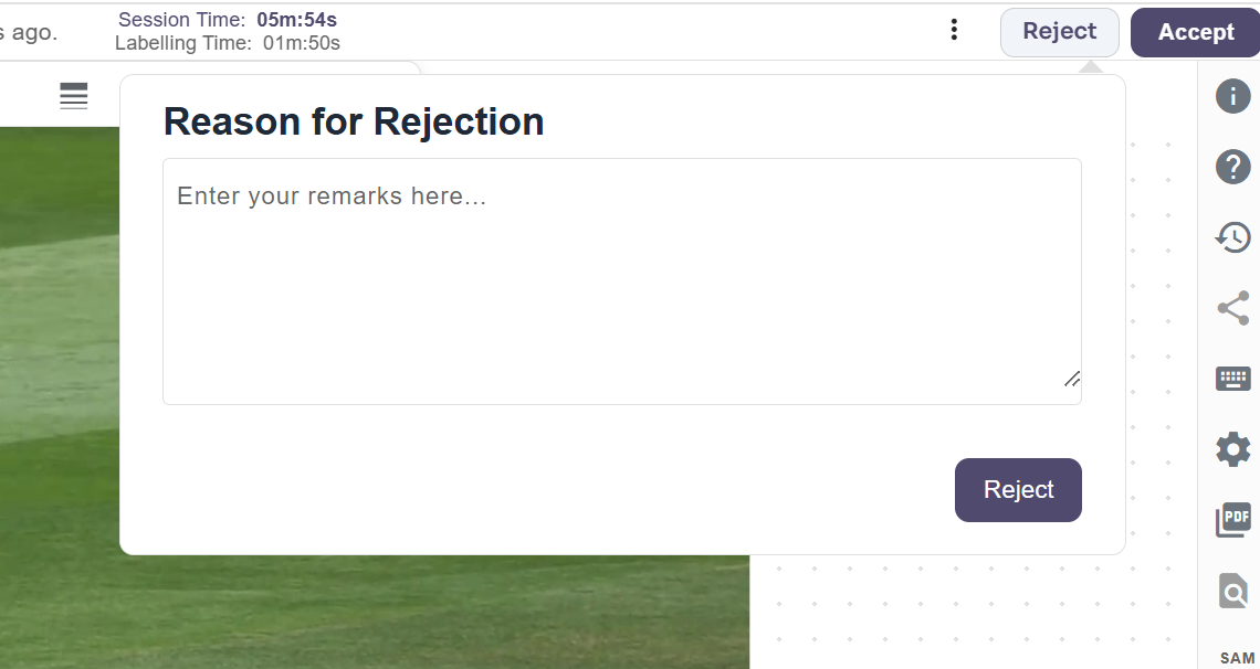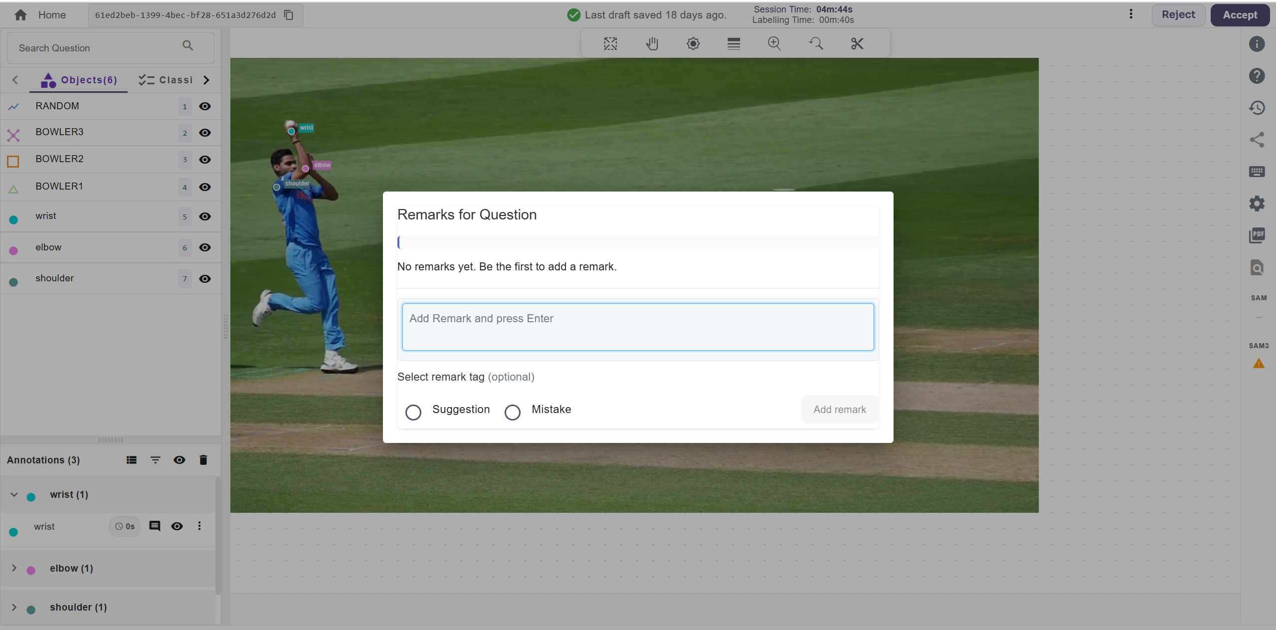 - To give remarks, click the comment icon next to the annotated object’s name and type your feedback. Select “Mistake” if the annotation is incorrect, or “Suggestion” to propose improvements. Then, click the “Add Remark” button to submit your feedback.