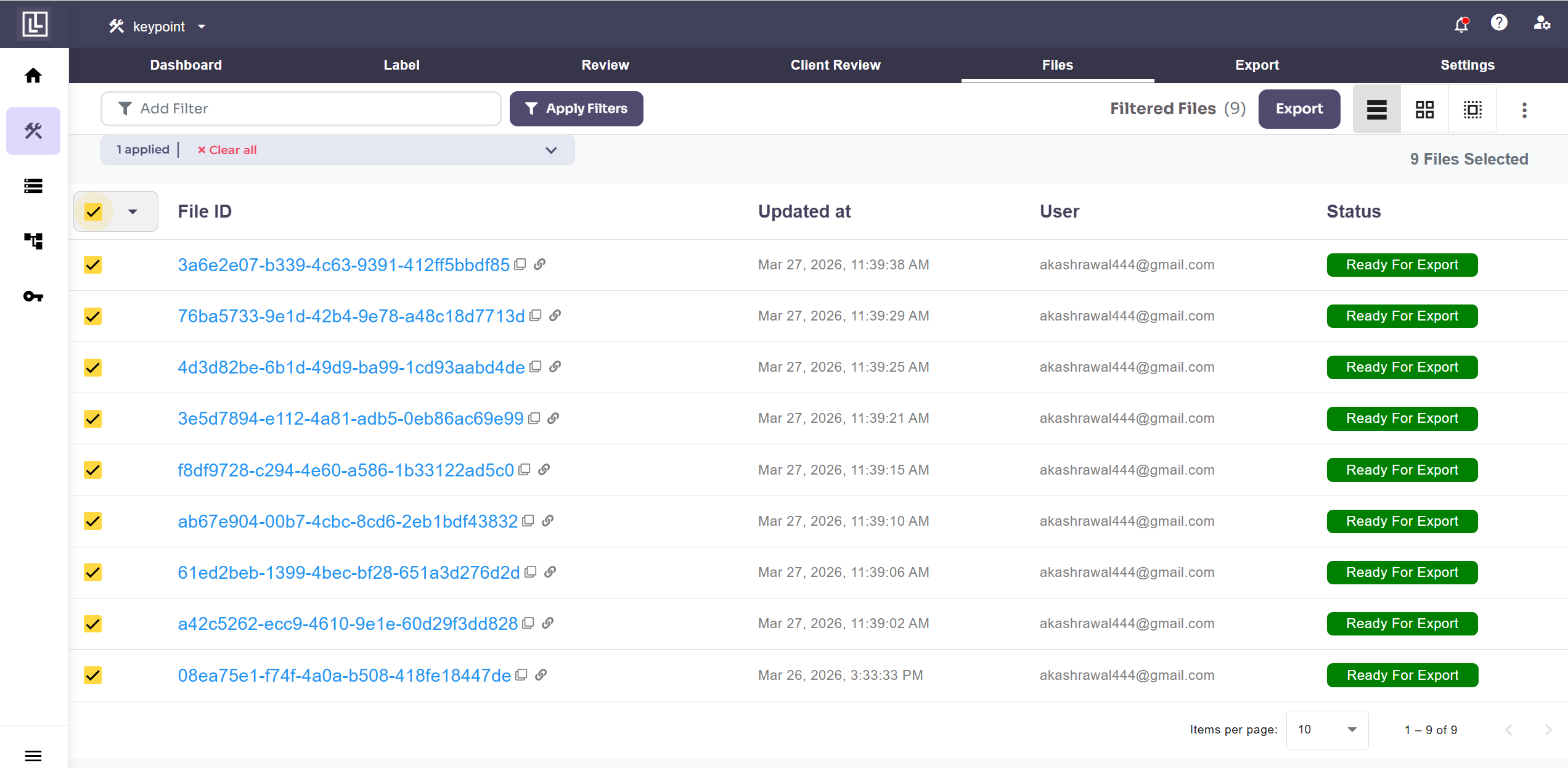 Select desired filters among the dropdown option of filters. For example, if you need files for “Final export” then choose a status “Ready for Export”. Then click the button Apply Filters.